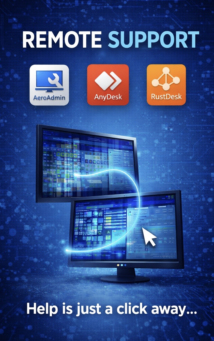 Secure remote connections available through AeroAdmin, RustDesk, or AnyDesk — whichever you prefer.